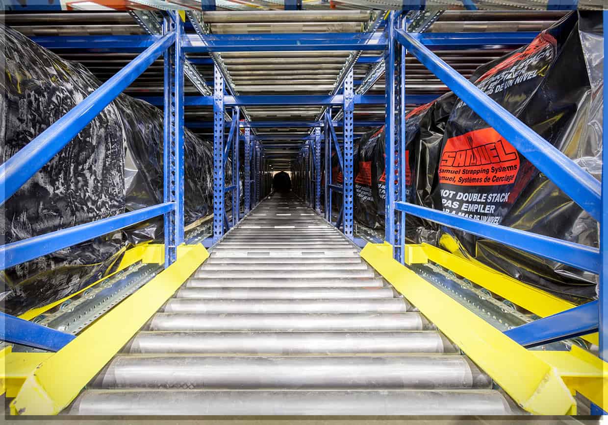 Each lane in a pallet flow rack is equipped with rollers set at a slight pitch. When a pallet is placed at the load end, it rolls down toward the pick face. As pallets are removed from the front, the next in line automatically advances.