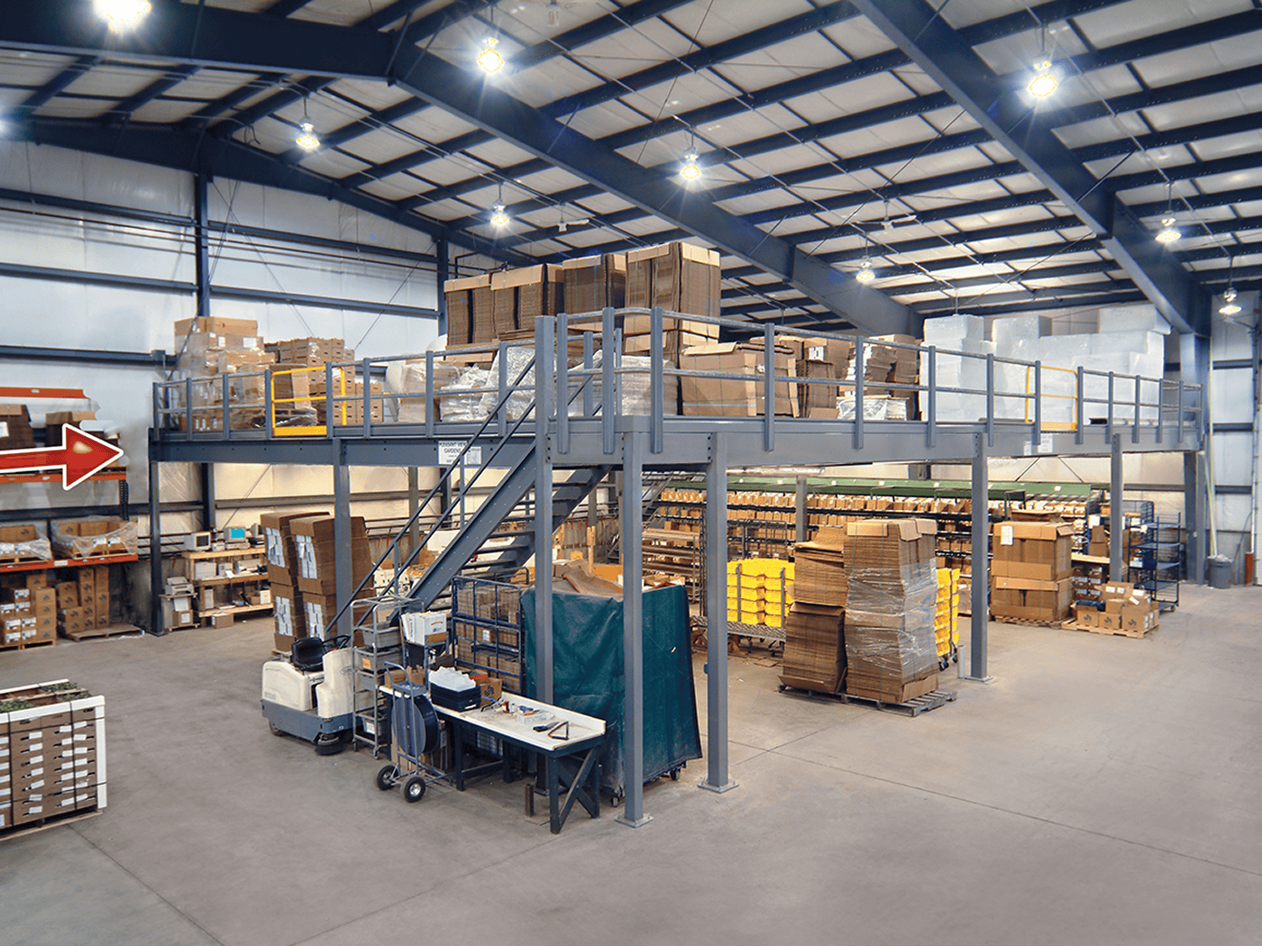 A rack or shelving-supported mezzanine is a great way to maximize your storage capacity on the floor while doubling your storage space. Available as a full deck-over floor or in a catwalk style configuration, rack or shelving supported structures are typically far more economical than freestanding mezzanines.