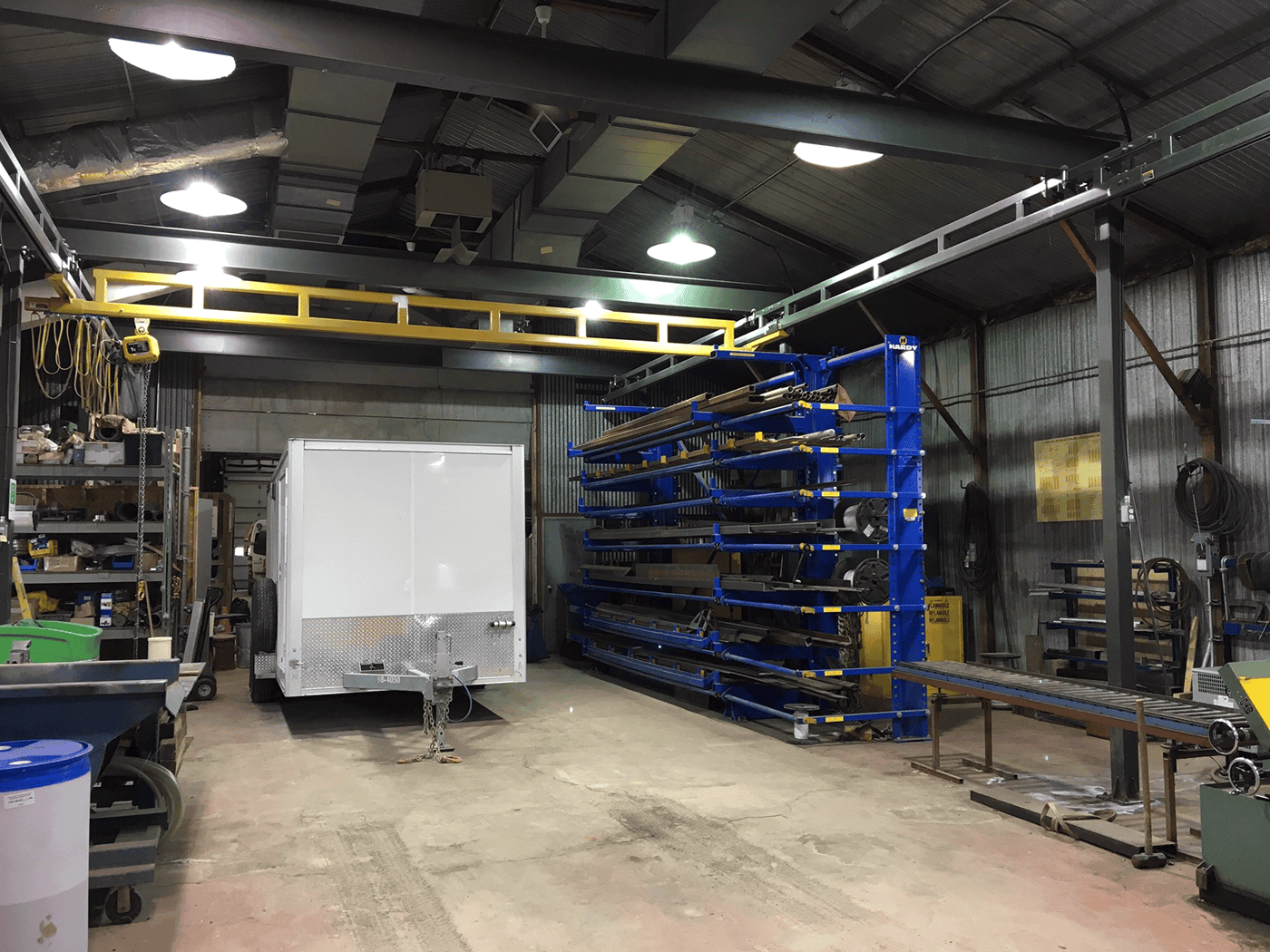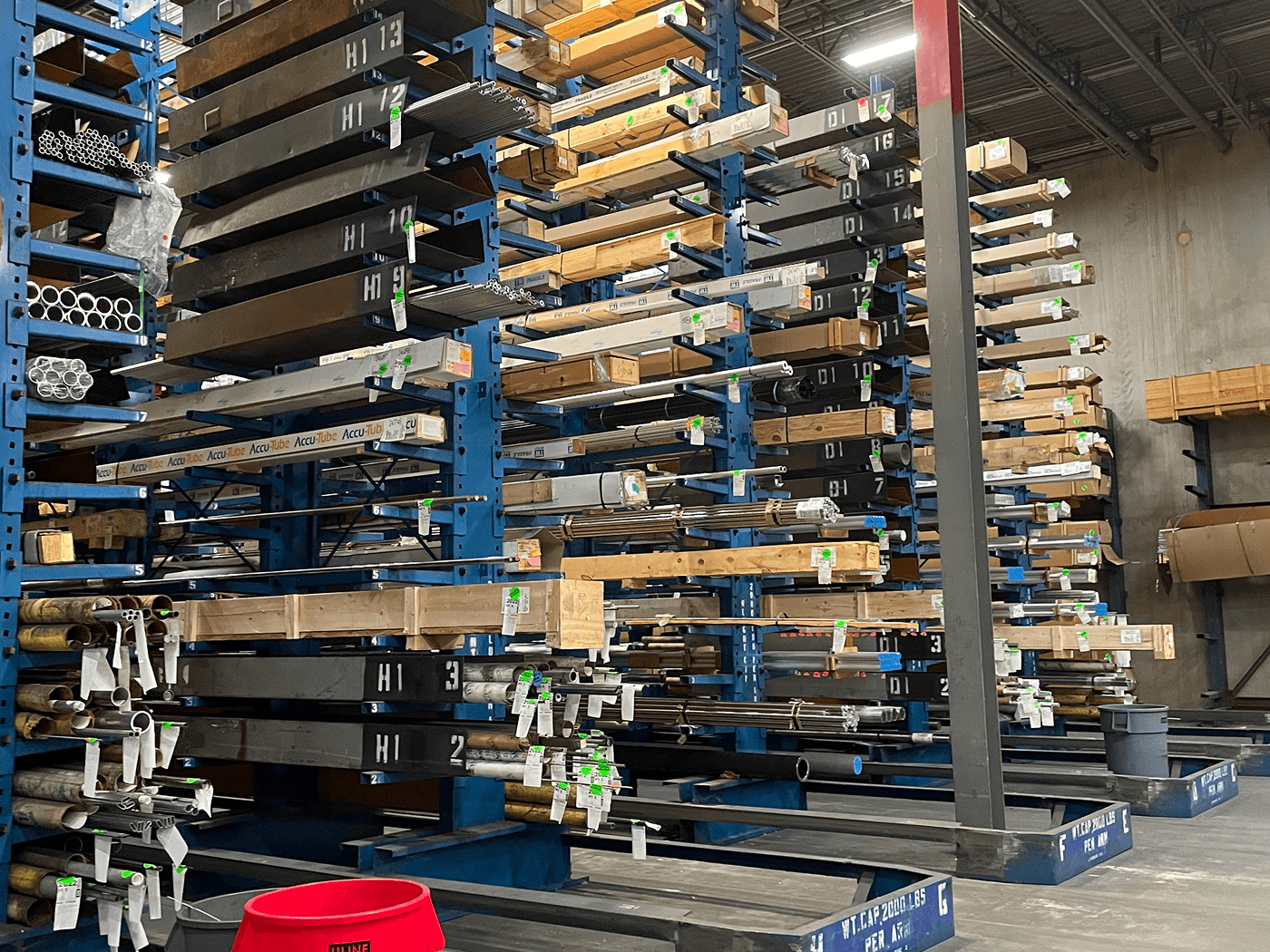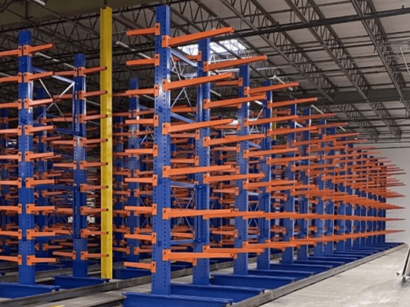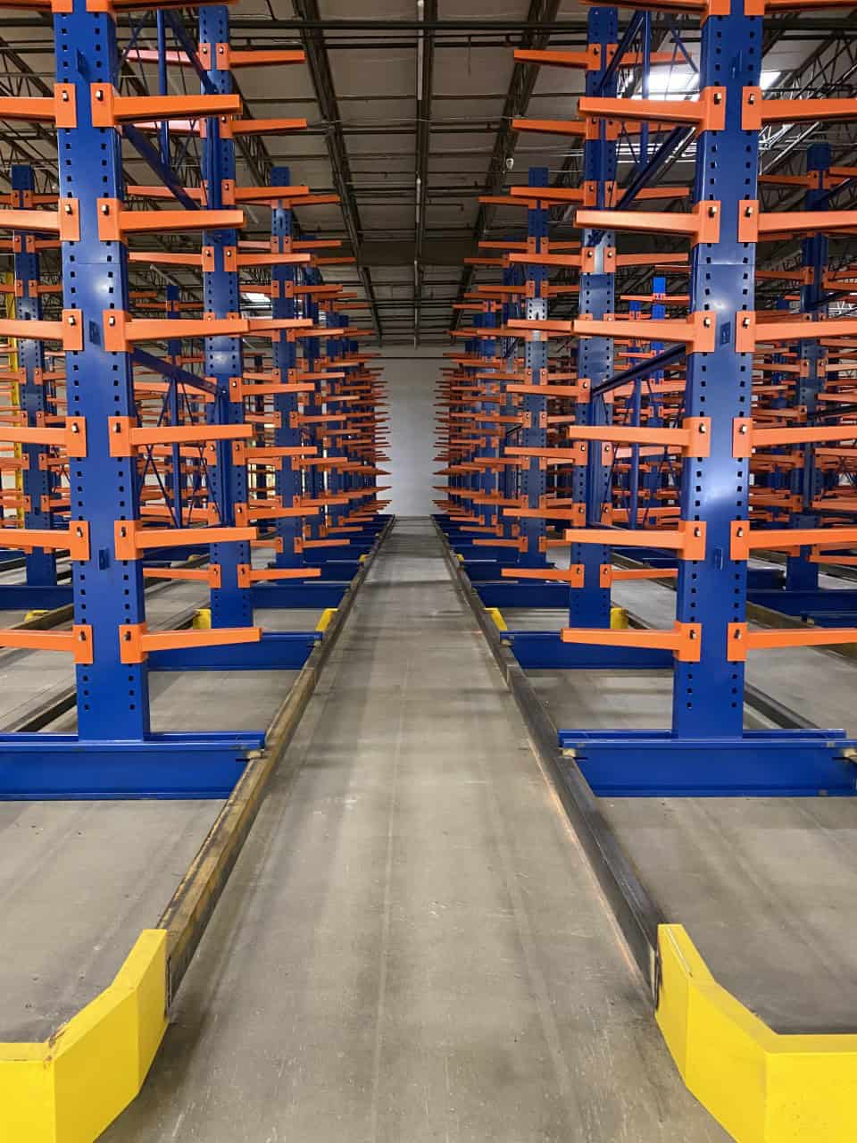 Roll-out cantilever racks provide easier accessibility to materials, allowing a crane to pick vs a lift truck reaching the materials.