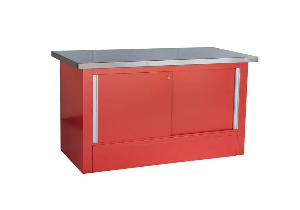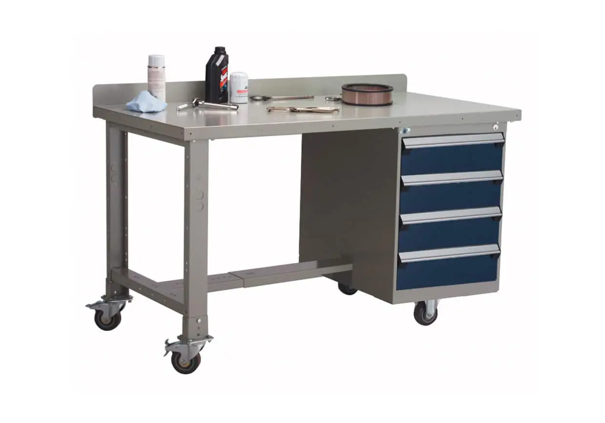 Workbenches by Rousseau come in three lengths along with a choice of 20 standard colors and six types of tops. Cabinets and accessories can be added to customize the workbench configuration.