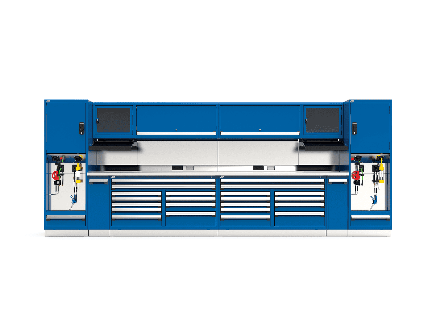 Technician workstations by Rousseau can be customized to a wide variety of sizes, configurations, colors, and accessories that maximize storage.